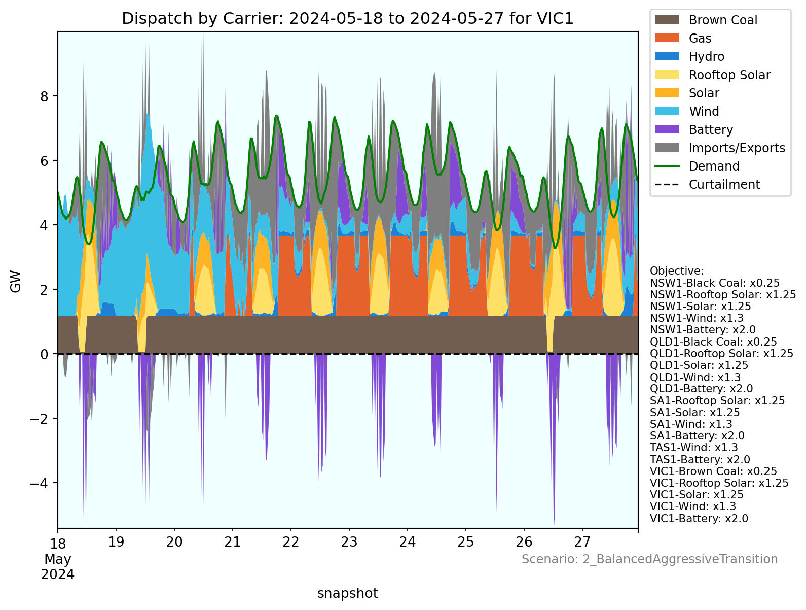 # Load the network for the specific scenarion = pypsa.Network("results/scenarios/2_BalancedAggressiveTransition.nc")# Metadata to provide as arguments to the plot_dispatch() function.scenario ="2_BalancedAggressiveTransition"objective_text = df_results.loc[df_results["Scenario"] == scenario, "Objective"].values[0]