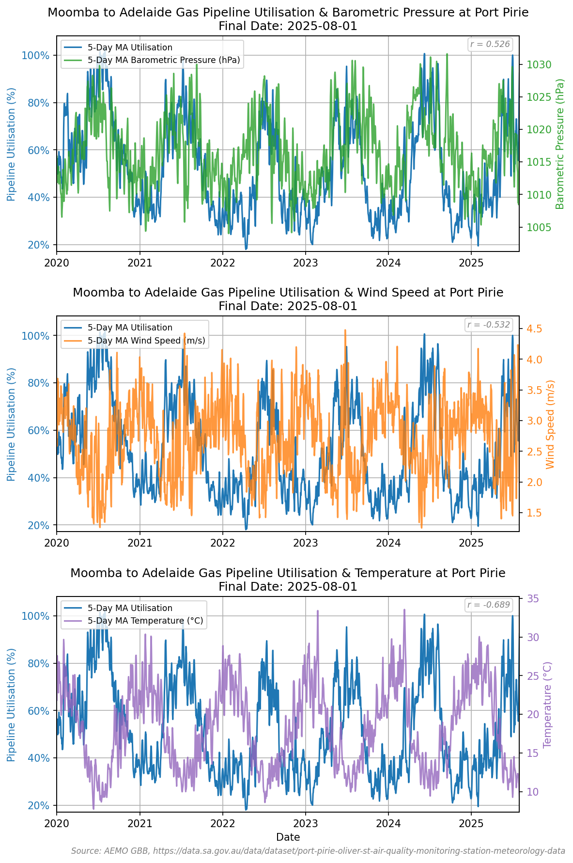 The below plot highlights the relationship between 5-day moving average (MA) Moomba to Adelaide gas pipeline utilisation, barometric pressure, wind speed and temperature at Port Pirie in South Australia.