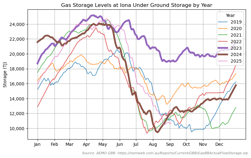 Taking a quick look at gas storage levels at the Iona underground storage facility highlights the sensitivity of temperature to gas utilisation in 2023 compared to 2024, which had closer to average winter temperatures.