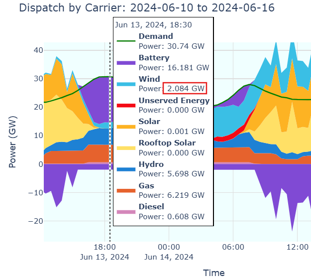 On the evening of June 13 at 18:30, wind generation across the entire NEM was 2.084 GW in the 8.3_VreCurtailReview scenario. This scenario assumes between 2–6 times the baseline wind capacity and 5–8 times the baseline battery storage. Despite this, storage resources were fully depleted, leading to unserved energy in the early hours of June 14.