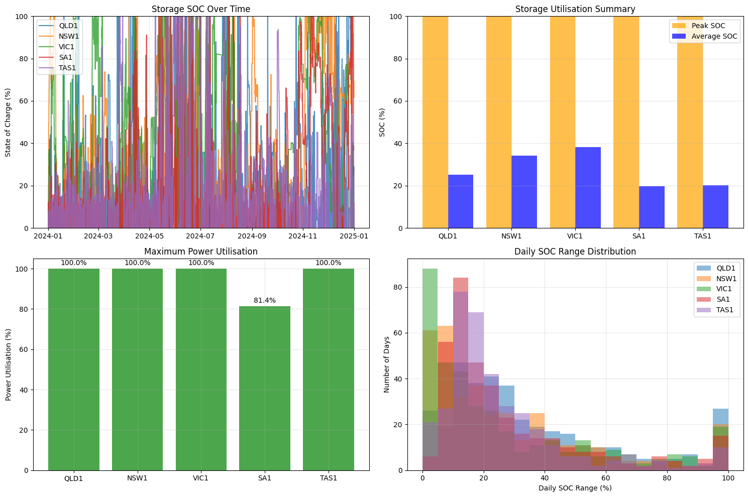 - Efficiency of storage on the way in and out set at 0.917 (round trip 0.84) via 2024 ISP Inputs and Assumptions workbook.